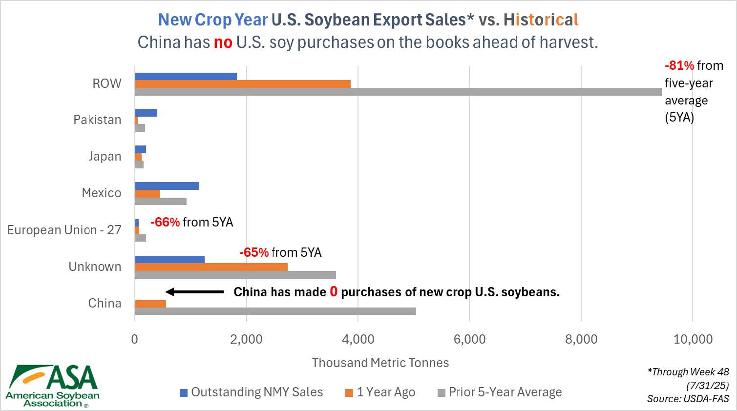 As a result, China currently has zero new crop export orders for U.S. soybeans on the books for MY 2025/26. This time of year, and in years in which trade disputes were a non-issue, China has typically ordered an average of 14% of its anticipated soybean purchases from the U.S. before soybean harvest begins in the Heartland, with a high of 27% ordered going into MY 2022/23. Other countries have not made up the difference either, with new crop sales down 81% from the five-year average.