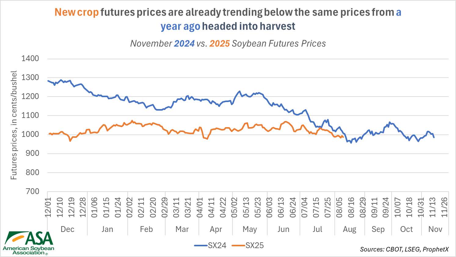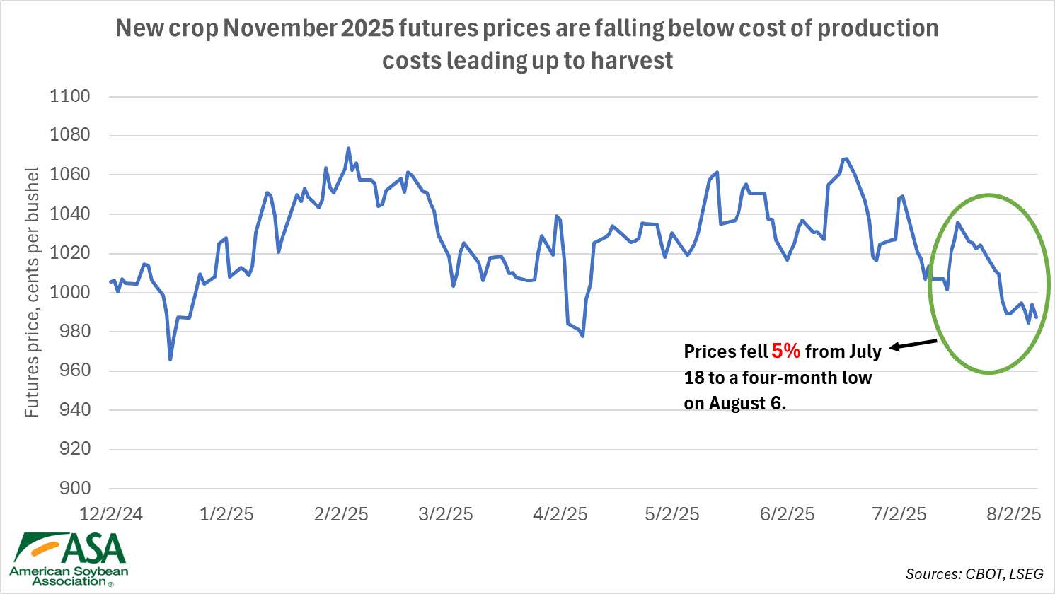 China’s absence from the new crop export market has dealt a heavy blow to U.S. soybean futures prices, especially as favorable U.S. growing conditions this summer will lead to above-trendline soybean yields to be produced in the 2025 crop year, which begins September 1. Between July 18 and August 6, new crop November 2025 soybean futures fell from $10.3575/bu. to $9.845/bu. amid increased U.S. production expectations and lack of new crop export orders from China.