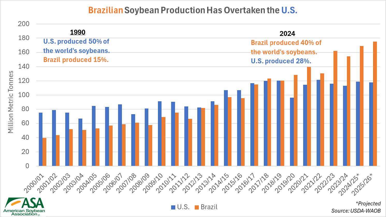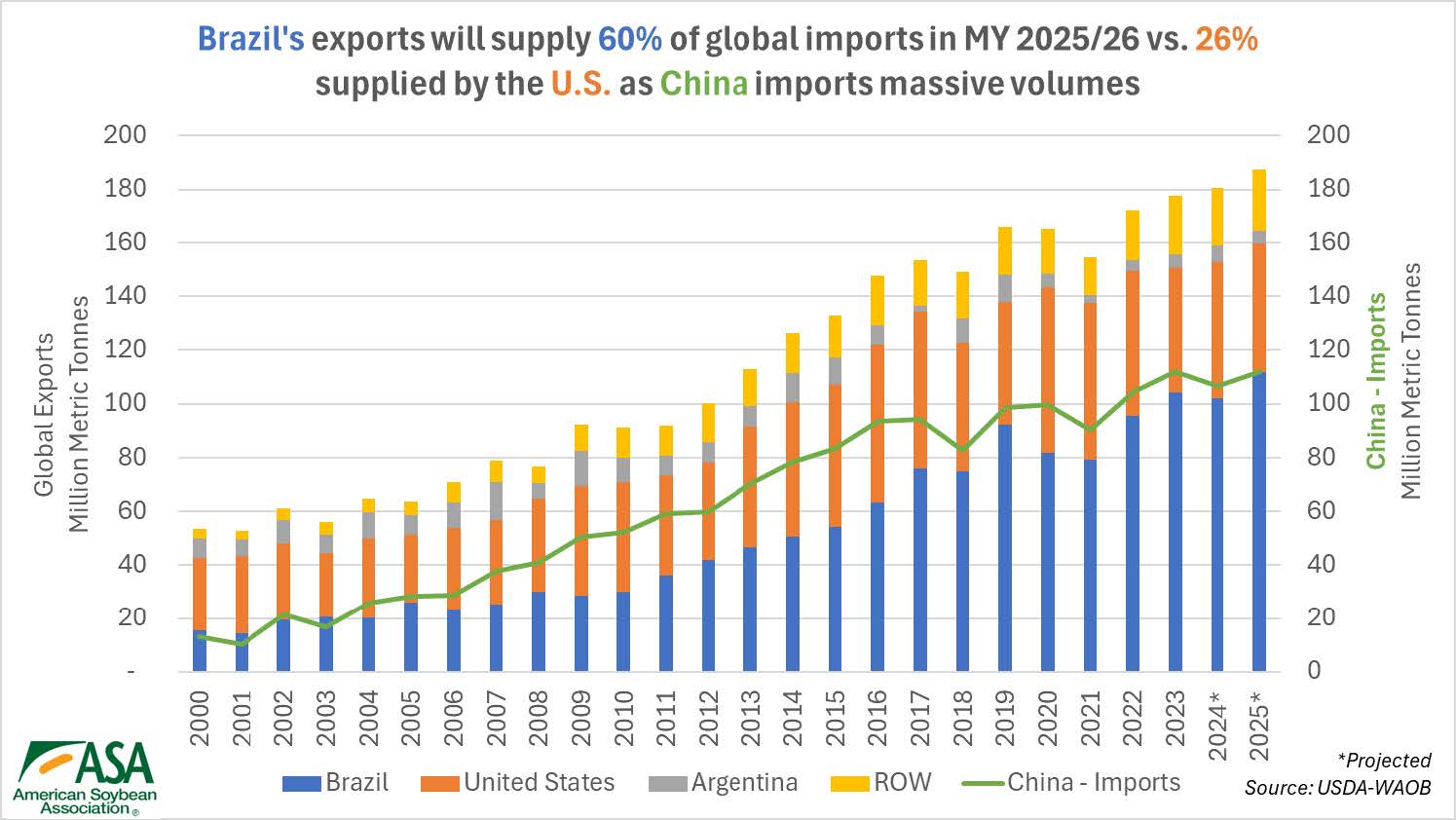As China’s soybean purchases from Brazil grew, the lower costs, favorable currency exchange rates and additional infrastructure investments from China expanded profits for Brazilian producers, pushing more soybean acres into production in Brazil. USDA projects Brazil produced 42% more soybeans than the U.S. in MY 2024/25, supplying its export market with 112 MMT which is an equivalent volume to China’s MY 2024/25 imports that also totaled 112 MMT.