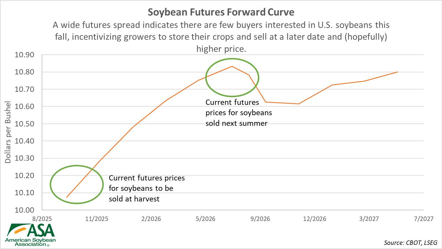 Currently, futures spreads for delivery throughout the upcoming 2025/26 marketing year are abnormally wide. This dynamic will result in farmers, traders, processors and exporters storing as many soybeans as possible nearby as early as possible in the harvest season.