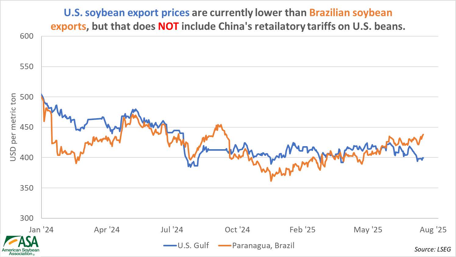 The combination of 20% retaliatory tariffs as well as VAT and MFN taxes have pushed China’s overall duty rate on U.S. soybeans to 34% in 2025. While the new retaliatory rate is 5% lower than during the 2018 trade war, the added retaliatory duties will keep U.S. soybean prices prohibitively more expensive than South American soybean supplies ahead of U.S. harvest this fall.