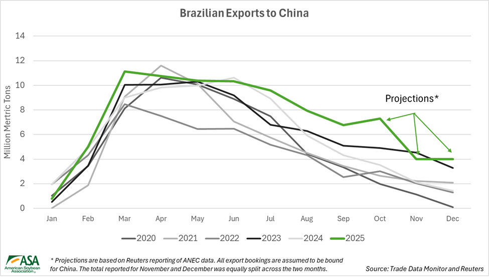 This seasonal pattern continued in 2025, but the tail off in exports to China has been much slower than usual (Figure 1). Brazil’s large harvest coupled with likely stockpiling by China to buffer the trade war has led to the longer export season. The projections in Figure 1 are based on projections by Brazil exporters and are for total soy exports. Given that Brazil’s soybeans are selling at a premium to U.S. beans, it is quite likely that China is the overwhelming buyer as Brazilian beans are still cheaper for China than U.S. soy when the Chinese retaliatory tariffs are considered.