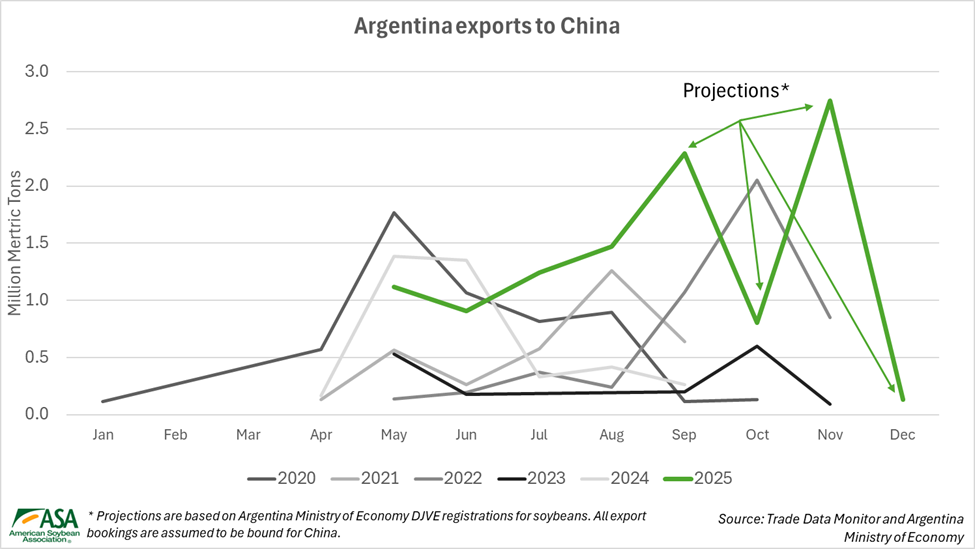 Argentina suspended the export tariffs effective Sept. 23 until Oct. 31 or $7 billion of exempt ag products had been sold. The financial limit was reached on Sept. 24, only one day later. According to the Argentina’s Ministry of Economy export license applications, there were 103 soybean export commitments submitted for a total of 5.1 MMT during the two days of eligibility. As with Brazil, it was assumed for this analysis that export commitments from Argentina are bound for China given its need for soy.
