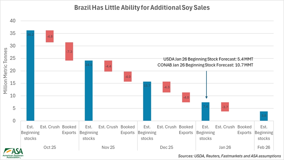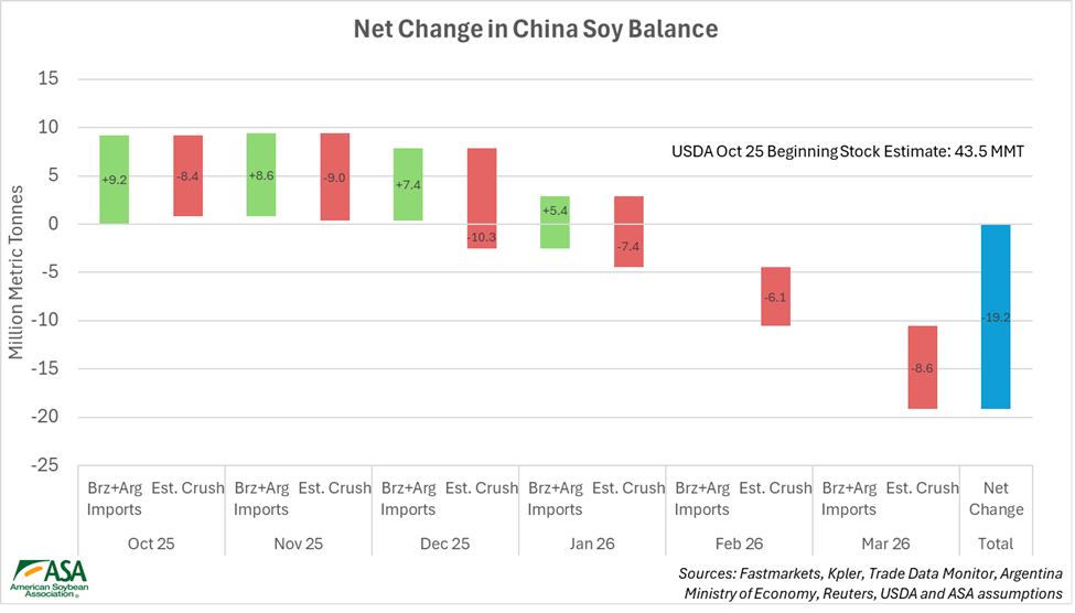 As previously mentioned, China’s soy needs largely appear filled through the end of the year. Normally, U.S. supplies start to land in the country at about this time and taper off after March. Without these supplies, China is projected to be 19.2 MMT short for its domestic crush needs before the new South American crop arrives. In the last complete marketing year with data (2024/2025), China reported soy imports from the United States of 26.1 MMT – slightly above the 19.2 MMT deficit.