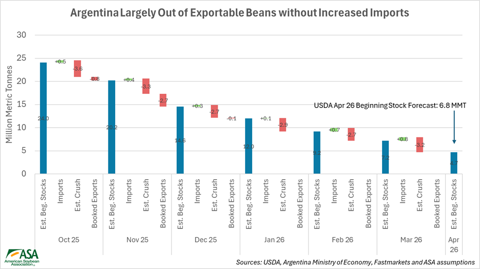 While Brazil imports almost no soy, Argentina does import a significant volume, so historical monthly import rates were added to the estimated soy availability for the country. Given Brazil has few soybeans left to sell, the historical Brazilian sales were not included, but these have been small the past two years.