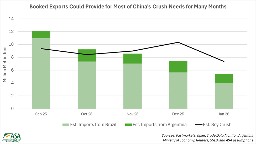 The Brazil and Argentina data was converted to Chinese imports by assuming 1.5 months between South American export and unloading in China. Under these assumptions, China can supply its soy needs by imports through November. The reduction in pace of booked exports later in the year allows crush to exceed imports in Dember 2025 and January 2026, although not by large amounts.